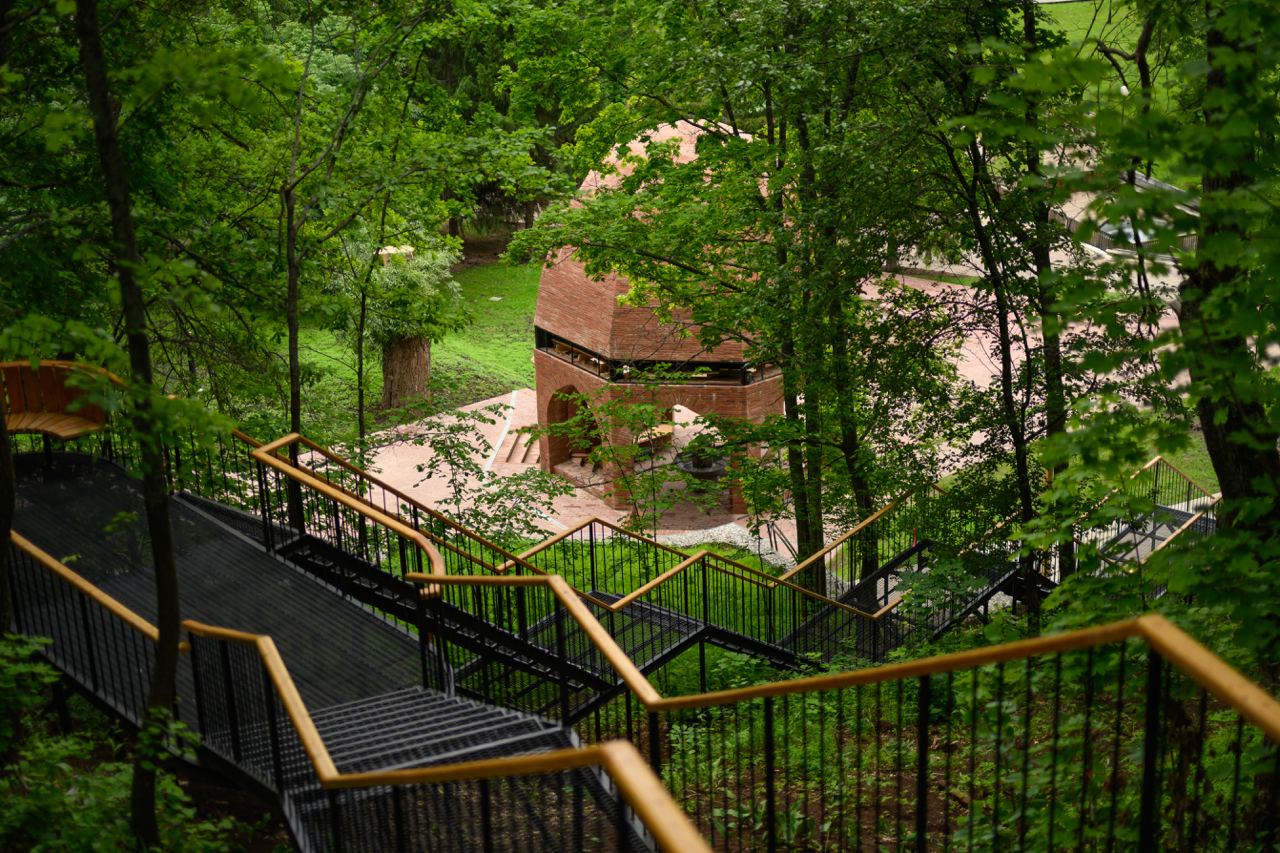 «Форма павильона Святого Ключа претерпела значительные изменения за 7 лет! За это время мы нарисовали около 33 вариантов павильона. От вертикальных стенок, похожих на капище, и табличек с рунами мы перешли к более типологичной сакральной геометрии — восьмиграннику и куполу сверху. Однако пропорции павильона, арочные своды и высокий купол, одновременно напоминающий сводчатый и шатровый, отражают соединение сакральных геометрий нескольких религий: православной, исламской и старых куполов древнего Биляра, то есть тенгрианской религии. Сплавленные типологии выявляют место трёх религий, паломники которых регулярно приходят сюда за святой водой», — рассказал архитектор и автор проекта Антон Кочуркин.
